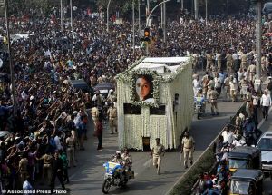 At one point police had to use batons to force back those unable to get into the hall where her body was laid out, wrapped in the Indian flag.