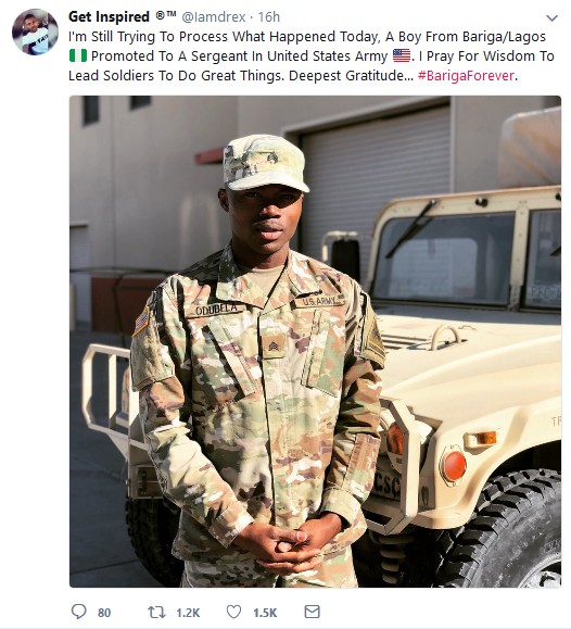 “I’m Still Trying To Process What Happened Today, A Boy From Bariga/Lagos Promoted To A Sergeant In United States Army. I Pray For Wisdom To Lead Soldiers To Do Great Things. Deepest Gratitude… #BarigaForever.”