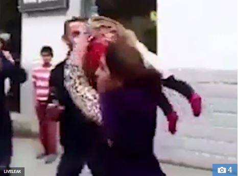One of her friends then casually hands her the toddler and without a second’s hesitation she flips the baby around and appears to use him as a weapon to attack her target.