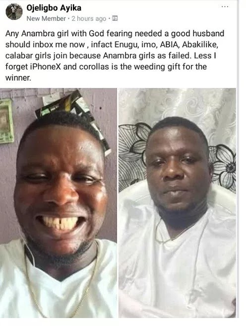 “Any Anambra girl with God fearing needed a good husband should inbox me now, infact Enugu,imo, ABIA, Abakilike, calabar girls join because Anambra girls as failed. Less i forget iPhoneX and corollas is the wedding gift for the winner”