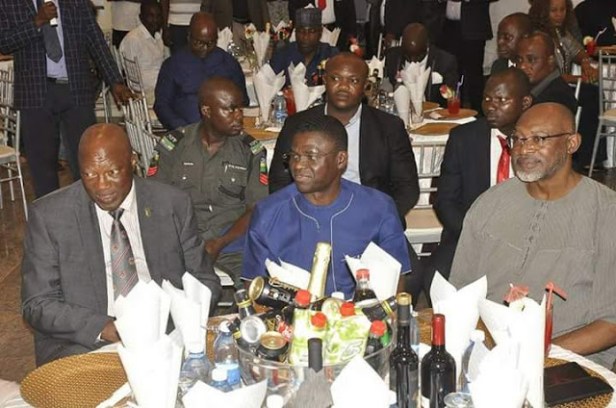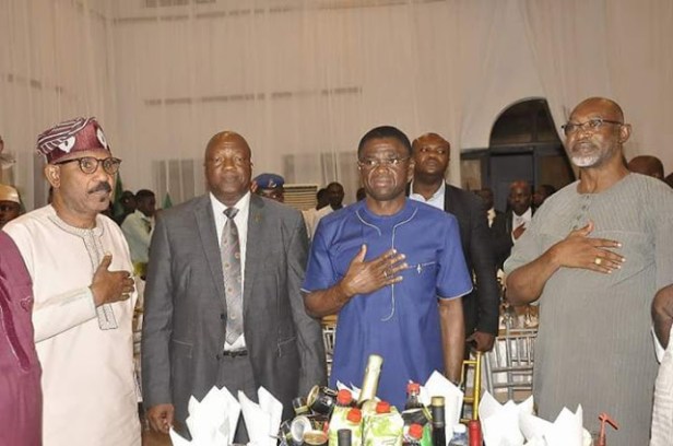 L-R: Senator Olorunnimbe Mamora; Secretary to Edo State Government, Osarodion Ogie Esq., and Representative of Edo State Governor and Deputy Governor, Edo State, Rt. Hon. Philip Shaibu; and Chairman, Edo State Chapter of the All Progressives Congress (APC), Barr. Anslem Ojezua, during a dinner at the 5th Progressive Governors’ Forum Quarterly Meeting for Secretaries to the Governments of APC-controlled states in Benin City, Edo State, at the weekend.