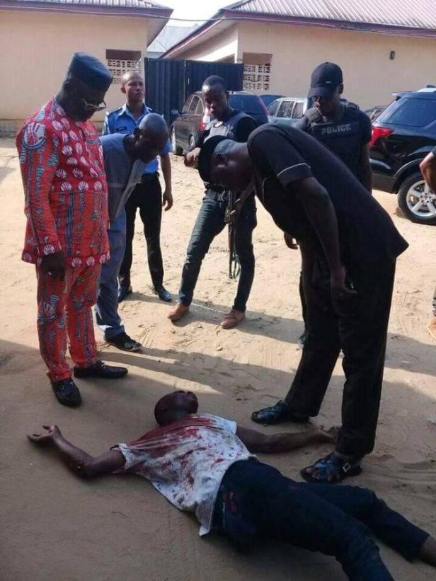 The angry mob descended on the robber after he and his gang members had robbed a filling station along Oron Road in Uyo, Akwa Ibom state. Report has it that two others had already escaped while one was caught with guns and money.