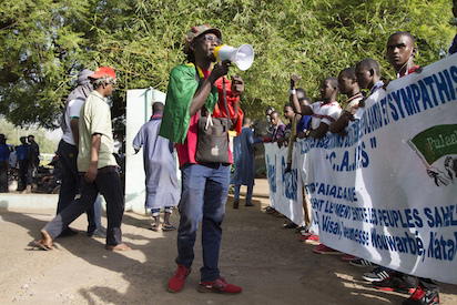 Mamadou Djabipo speaks to the crowd on March 15, 2018 during a demonstration in Bamako organized by the Jeunesse Tabital Pulaaku-Mali, the youth chapter of an organization dedicated to preserving the rights of Mali’s Fulani people, who have become victims of retaliatory violence after being accused of attacks against farmers in central Nigeria’s Plateau state. / AFP PHOTO