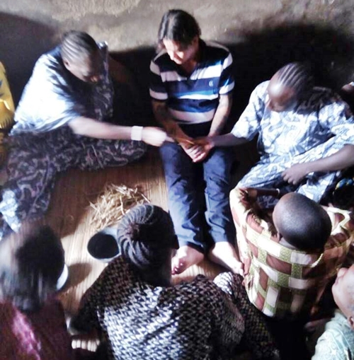 Photos have emerged online showing the moment a foreigner was being initiated at a Sango shrine in Oyo State and also issued a certificate from the Alaafin of Oyo.