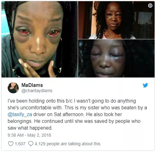 “I’ve been holding onto this b/c I wasn’t going to do anything she’s uncomfortable with. This is my sister who was beaten by a @taxify_za driver on Sat afternoon. He also took her belongings. He continued until she was saved by people who saw what happened.”