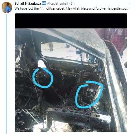 Uncategorized 5 junior police cadets die in a ghastly motor accident while on their way home after a break Date: May 6, 2018Author: daybreaknewonline 0 Comments Five junior police cadets including a female officer lost their lives in a ghastly motor accident that happened along Kano -Zaria highway while on their way home after a break. The sad incident was shared on Twitter by Cadet Suhail Share this: Share on X (Opens in new window) X Share on Facebook (Opens in new window) Facebook Share on LinkedIn (Opens in new window) LinkedIn Share on Pinterest (Opens in new window) Pinterest Share on Telegram (Opens in new window) Telegram Share on WhatsApp (Opens in new window) WhatsApp Email a link to a friend (Opens in new window) Email Like Loading... Related