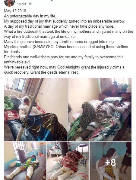 Ezemoro John Ifeaghochukwu said fire broke out after the accident and it killed his mother, one other, and injured many others. This led to the cancellation of his traditional marriage.