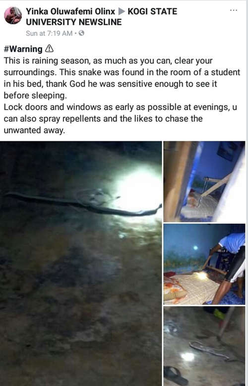 A Facebook user identified as Yinka Oluwafemi, has taken to the social networking platform to warn students of the Kogi State University to exercise more caution, use repellents and lock doors and windows.