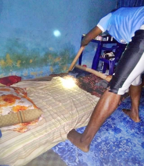 He shared some photos from the scene of the incident and wrote: “#Warning: This is raining season, as much as you can, clear your surroundings. This snake was found in the room of a student in his bed, thank God he was sensitive enough to see it before sleeping.