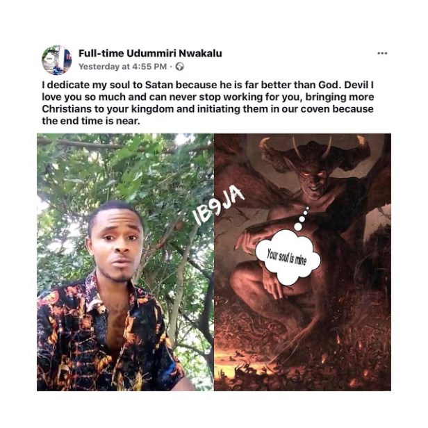Uncategorized Has he gone mad: I’m dedicating my soul to Satan because he is better than God – Nigerian man Date: August 10, 2018Author: daybreaknewonline 0 Comments I’m dedicating my soul to Satan because he is better than God – Nigerian man Share this: Share on X (Opens in new window) X Share on Facebook (Opens in new window) Facebook Share on LinkedIn (Opens in new window) LinkedIn Share on Pinterest (Opens in new window) Pinterest Share on Telegram (Opens in new window) Telegram Share on WhatsApp (Opens in new window) WhatsApp Email a link to a friend (Opens in new window) Email Like Loading... Related