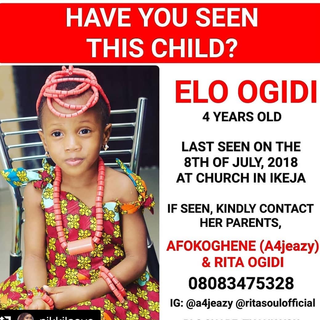 ELO OGIDI, a 4 year old girl has been missing since the 8th of July, 2018 as she was picked by an unidentified person at the children’s department of her parents’ church on a Sunday morning.