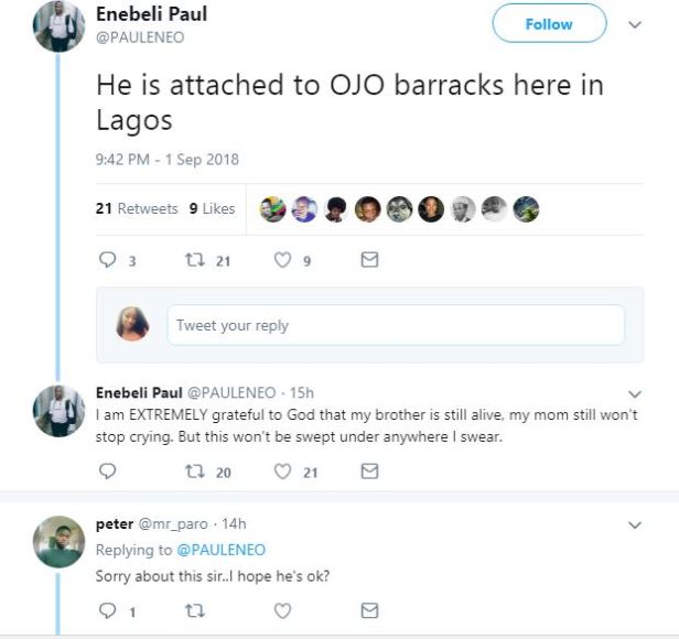 Twitter user Enebeli Paul has cried out after his brother got stabbed in the neck by a Serving Nigerian soldier in Lagos, Although He didn’t give much details but according to him, The officer named Daniel Gbenga stabbed the young man with a broken bottle after they had dispute over Money, Though he still alive but the mom has been in tears for days now,