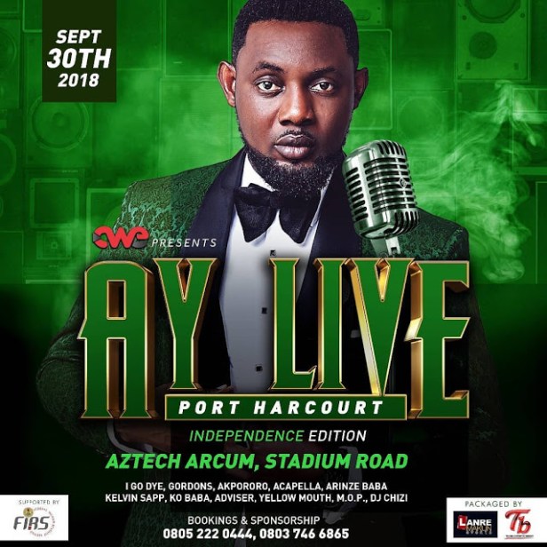 The biggest comedy show in Nigeria is ready to take over the Garden once again with it’s usual Independence edition of AY Live on September 30. The night will be featuring leading A-list comedians like I GO DIE, GORDONS, AKPORORO, ACAPELLA, ARINZE BABA, KELVIN SAPP, KO BABA, ADVISER, YELLOWMOUTH AND A HOST OF OTHER MIND BLOWING COMEDIANS