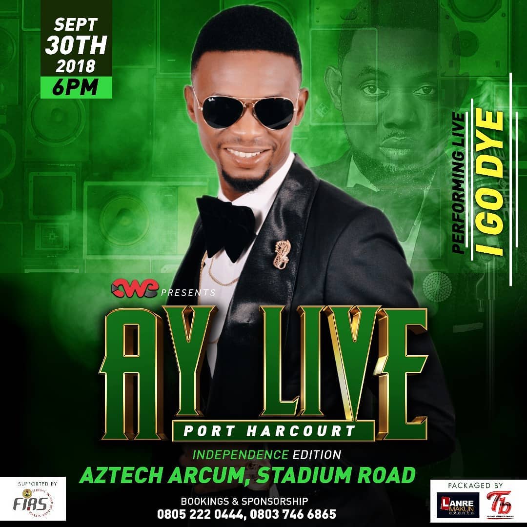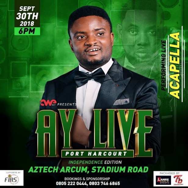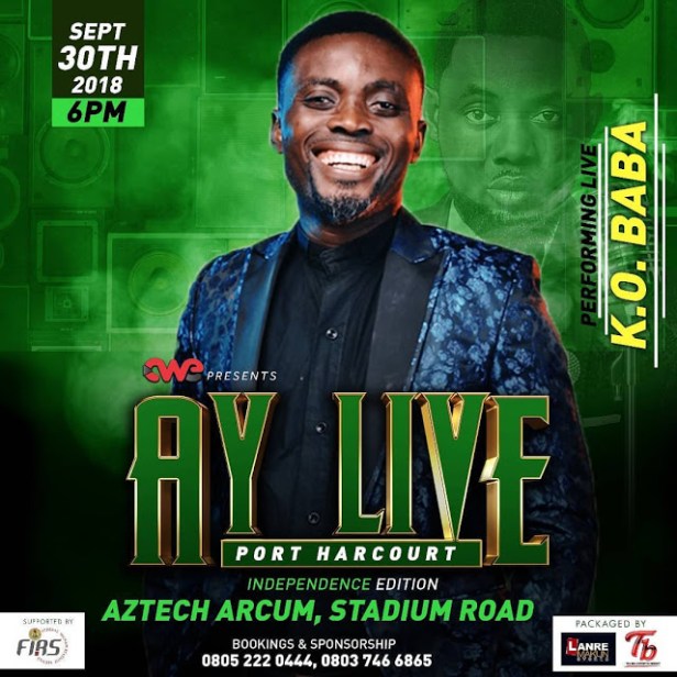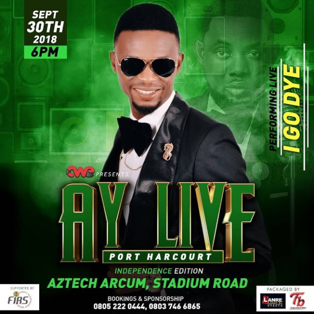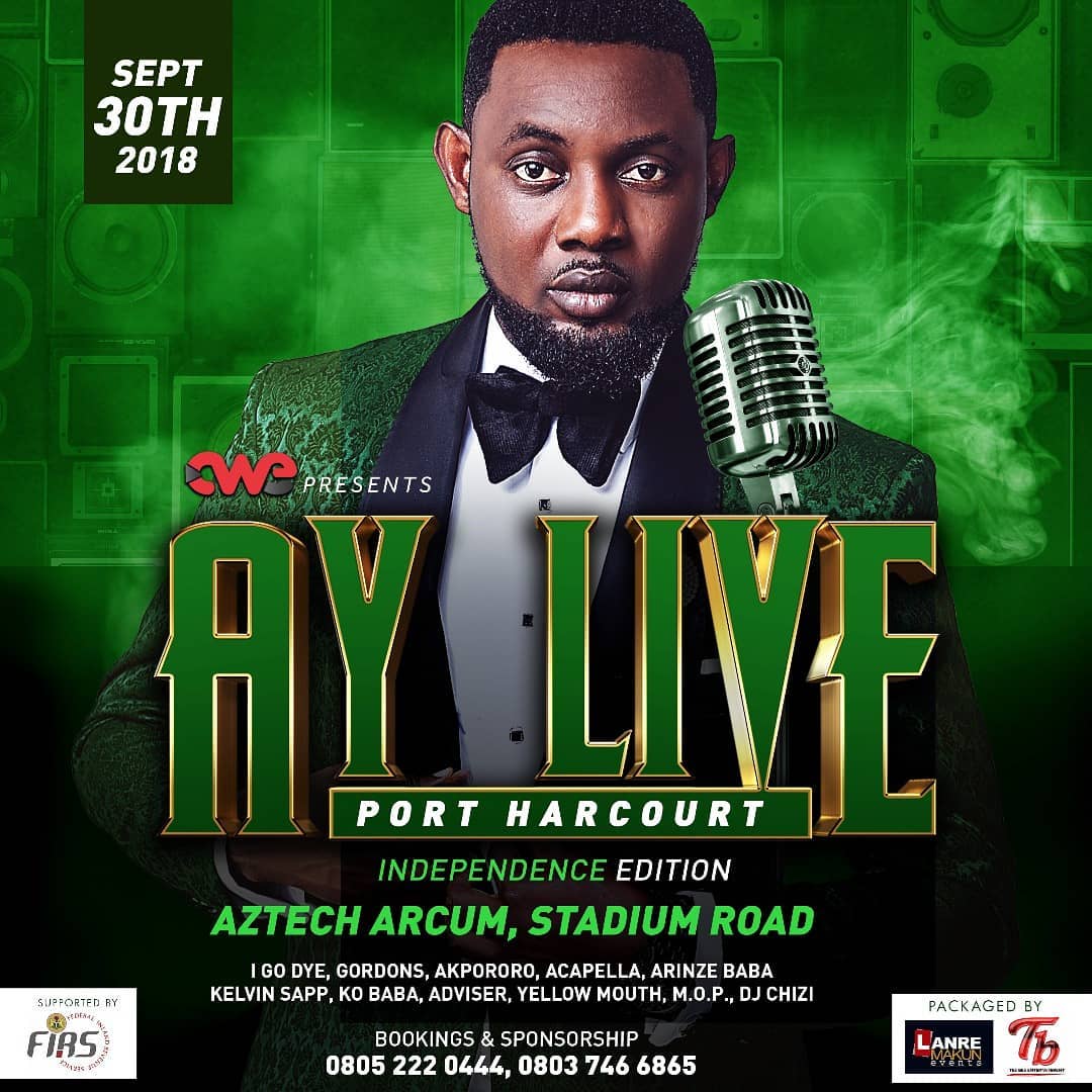 The biggest comedy show in Nigeria is ready to take over the Garden once again with it’s usual Independence edition of AY Live on September 30. The night will be featuring leading A-list comedians like I GO DIE, GORDONS, AKPORORO, ACAPELLA, ARINZE BABA, KELVIN SAPP, KO BABA, ADVISER, YELLOWMOUTH AND A HOST OF OTHER MIND BLOWING COMEDIANS