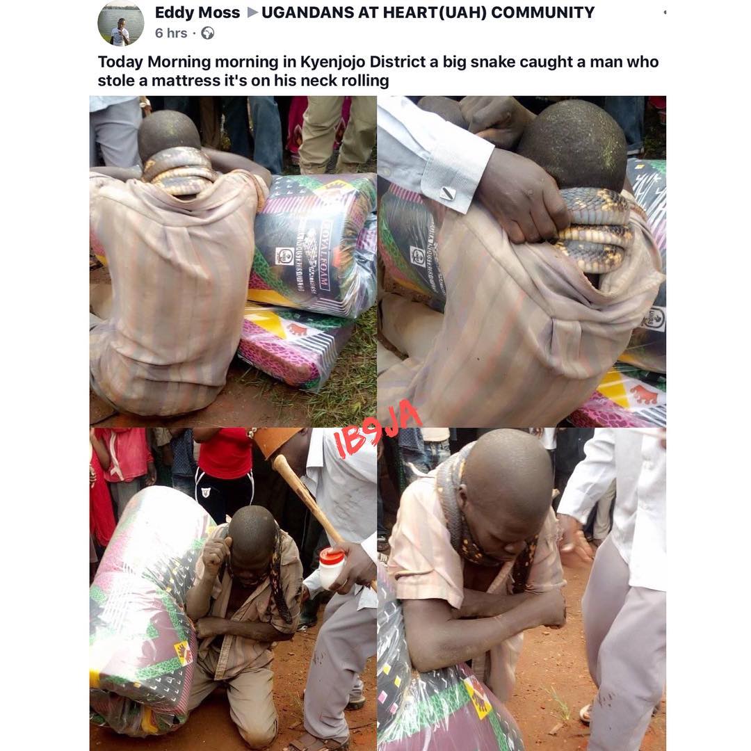 Uncategorized Snake nabs an Ugandan mattress thief by wrapping itself around his neck Date: September 17, 2018Author: daybreaknewonline 0 Comments Snake nabs an Ugandan mattress thief by wrapping itself around his neck Share this: Share on X (Opens in new window) X Share on Facebook (Opens in new window) Facebook Share on LinkedIn (Opens in new window) LinkedIn Share on Pinterest (Opens in new window) Pinterest Share on Telegram (Opens in new window) Telegram Share on WhatsApp (Opens in new window) WhatsApp Email a link to a friend (Opens in new window) Email Like Loading... Related
