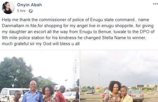 Onyin Abah later shared photos of her daughter with the Enugu state commissioner of police whom she said shopped for the girl and even gave her an escort from Enugu to Benue.