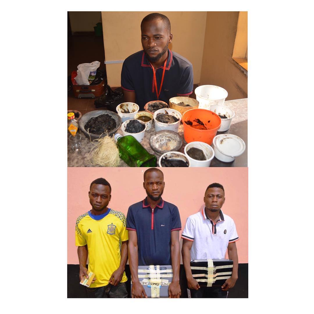 At the point of arrest, varied fetish materials, two laptops, and five different brands of telephones were recovered from them. Several documents containing false pretences were also recovered from the suspects.