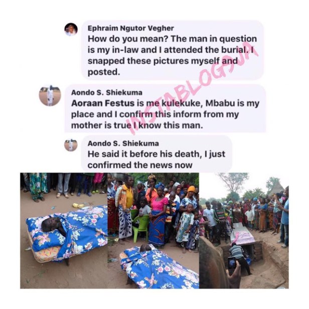 Man identified as Ajingir, granted his wish to be buried with a mattress, instead of a casket, yesterday, in Mbabu, Benue State.