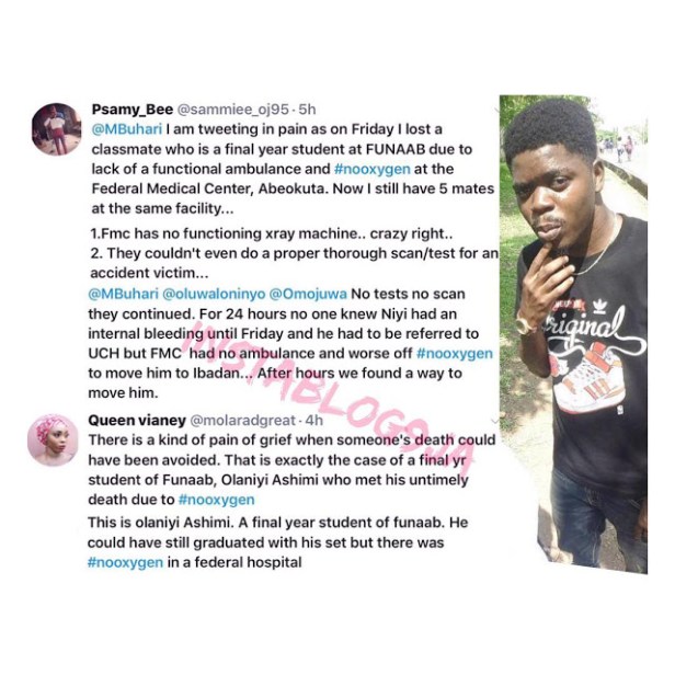 Uncategorized FUBAAB final year student dies due to the lack of oxygen at FMC Abeokuta, Ogun State Date: December 11, 2018Author: daybreaknewonline 0 Comments FUBAAB final year student dies due to the lack of oxygen at FMC Abeokuta, Ogun State Share this: Share on X (Opens in new window) X Share on Facebook (Opens in new window) Facebook Share on LinkedIn (Opens in new window) LinkedIn Share on Pinterest (Opens in new window) Pinterest Share on Telegram (Opens in new window) Telegram Share on WhatsApp (Opens in new window) WhatsApp Email a link to a friend (Opens in new window) Email Like Loading... Related