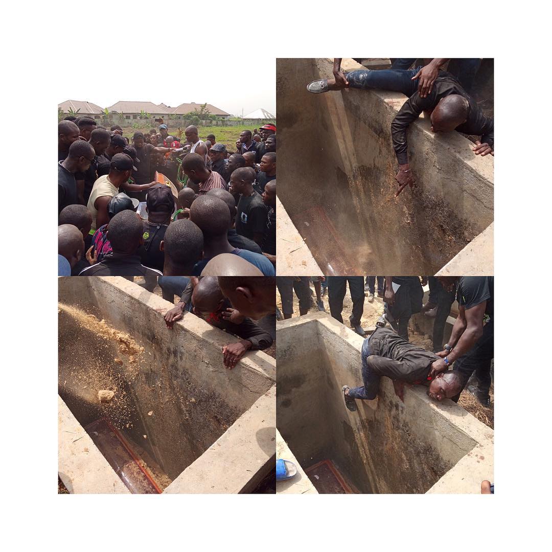 The deceased was recently killed by yet to be identified gunmen. It took the intervention of other mourners to prevent his friend from entering the grave with him.