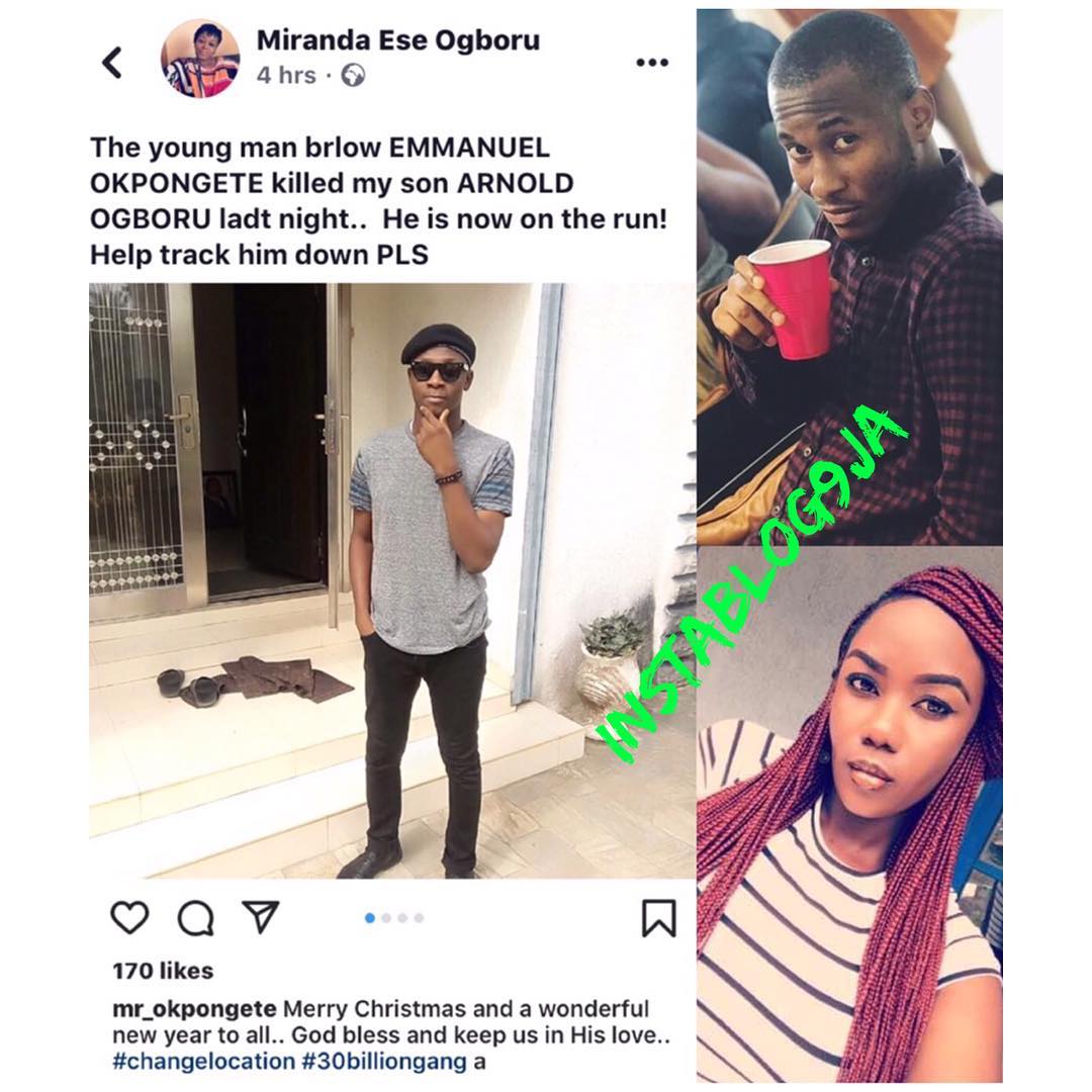 A grieving mother has cried out over the alleged murder of her son, Arnold Ogboru (top right), by one Emmanuel Douglas Okpongete who is the landlord of his girlfriend, Calista (bottom right), who is serving in Abak, Akwa Ibom State.