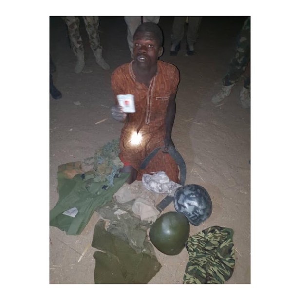He was found hiding in a room in possession of 2 military Ballistic helmets, a pair of military desert boot, a fragment jacket, a Jersey pull over, military backpack, camouflage design shorts, 2 voters identification cards, National identification card, amulets, camouflage T-shirts and military jungle hat. .