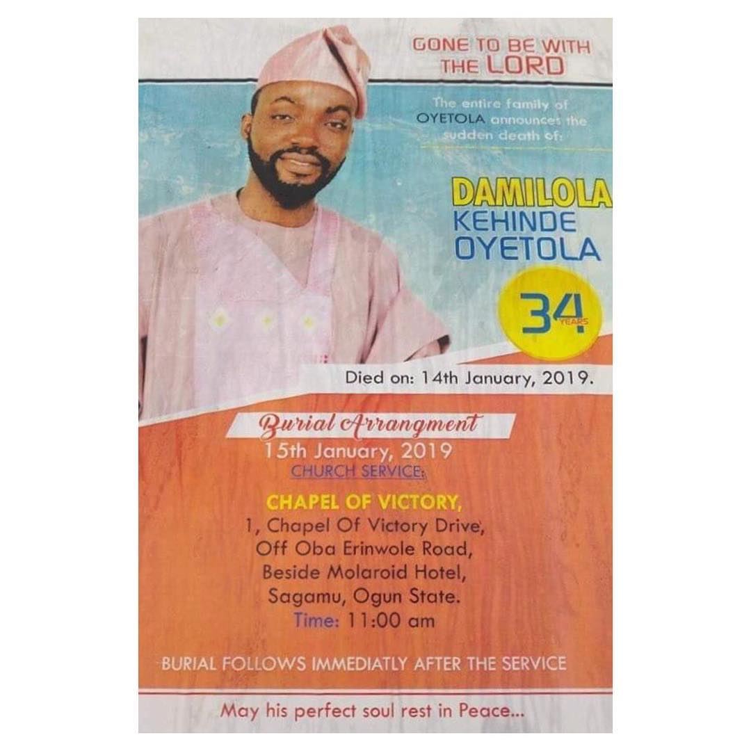 Oyetola Damilola, an Electrical Engineering lecturer at the Olabisi Onabanjo University has died.