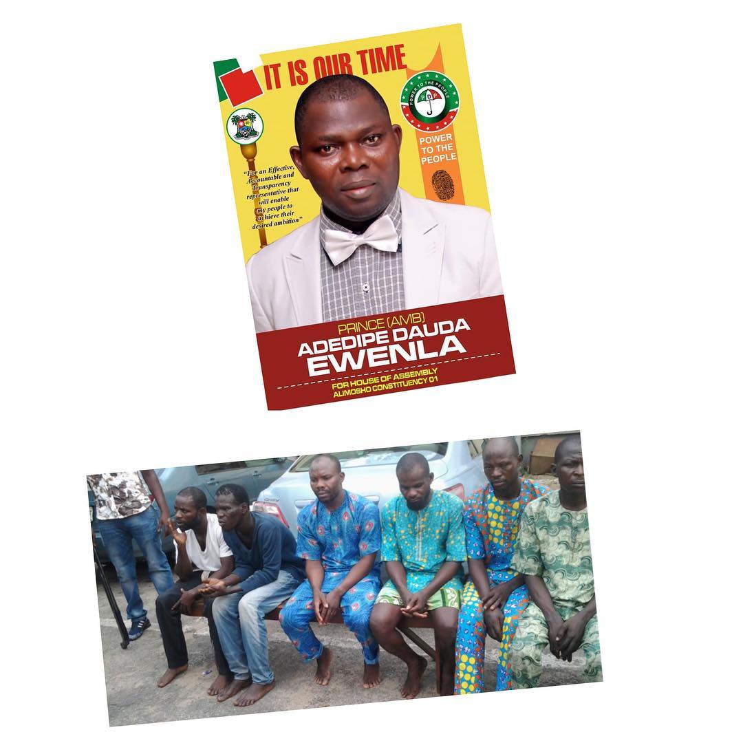The suspects are PDP House of Assembly aspirant Hon.(Amb) Adedipe Dauda Ewenla, 40, Rasak Oyakunle aka Akeregun; Abdulazeez Agboola aka Boggy, 29; Akin Ayansola alias Babalati, 44; Kazeem aka Aladija, 50 and Saheed Isiola alias Obama, 36.