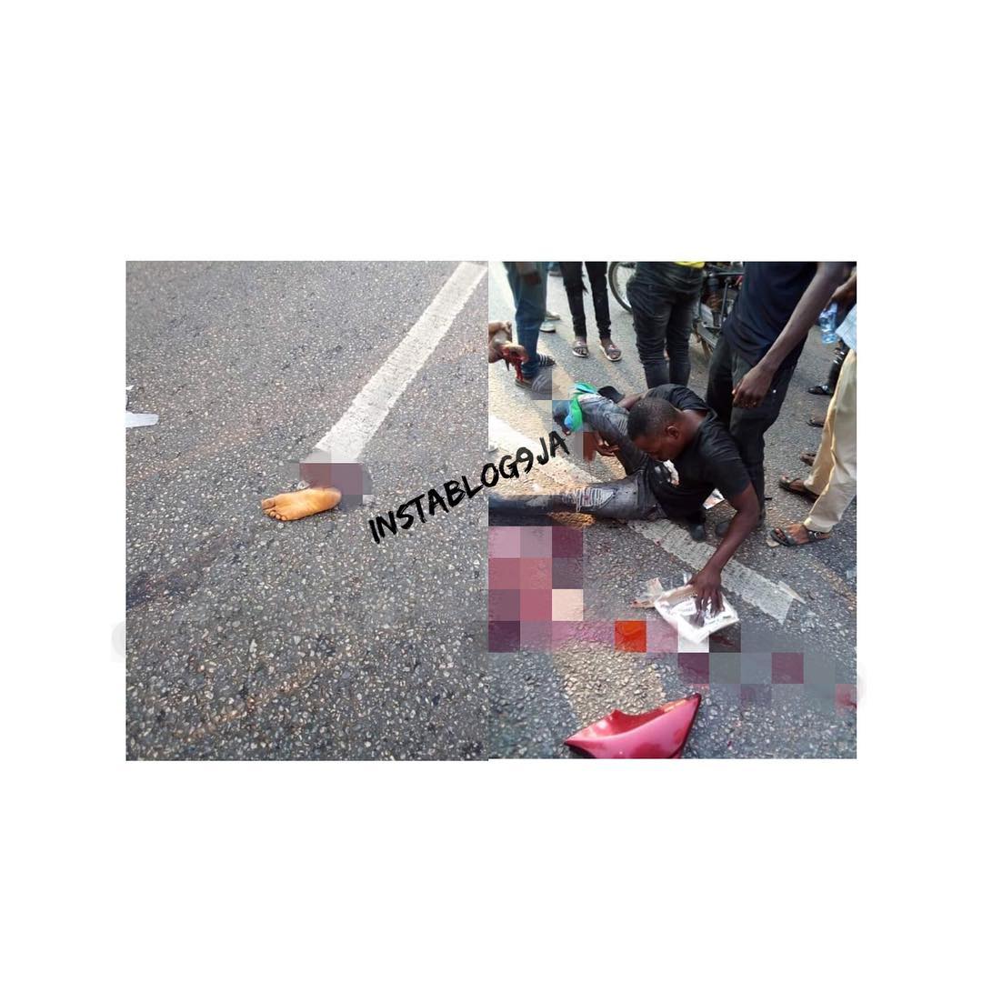 Painful : Bus cuts the leg of a party member during a political rally, yesterday, at Sokori, #Abeokuta, Ogun State