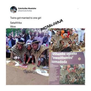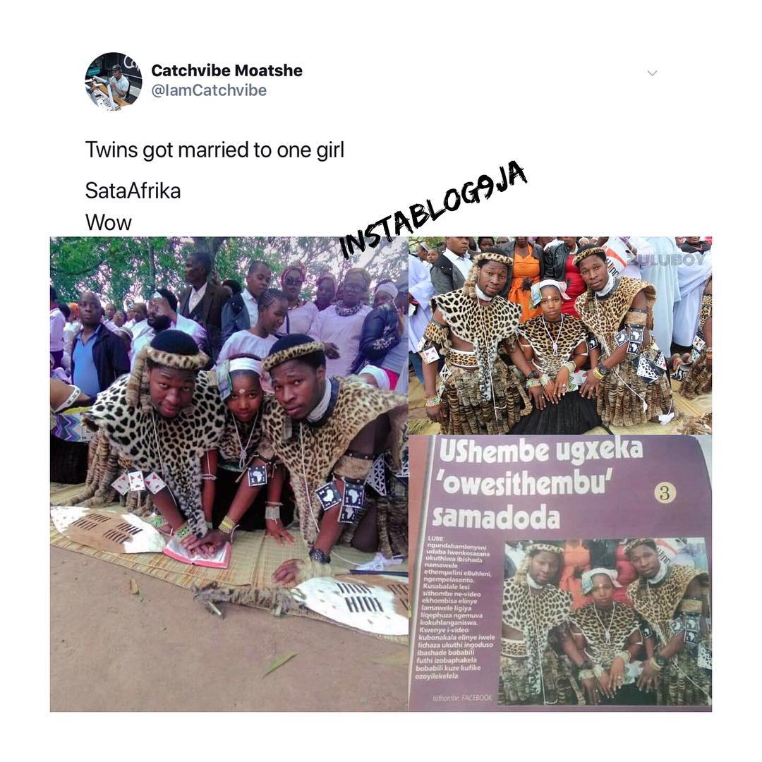 Uncategorized Twin brothers marry the same lady in South Africa Date: February 3, 2019Author: daybreaknewonline 0 Comments Twin brothers marry the same lady in South Africa, what is the world turning in to perhaps this act might be a custom in South Africa, what do you think? //native.propellerads.com/1?z=1983596&eid= Share this: Share on X (Opens in new window) X Share on Facebook (Opens in new window) Facebook Share on LinkedIn (Opens in new window) LinkedIn Share on Pinterest (Opens in new window) Pinterest Share on Telegram (Opens in new window) Telegram Share on WhatsApp (Opens in new window) WhatsApp Email a link to a friend (Opens in new window) Email Like Loading... Related