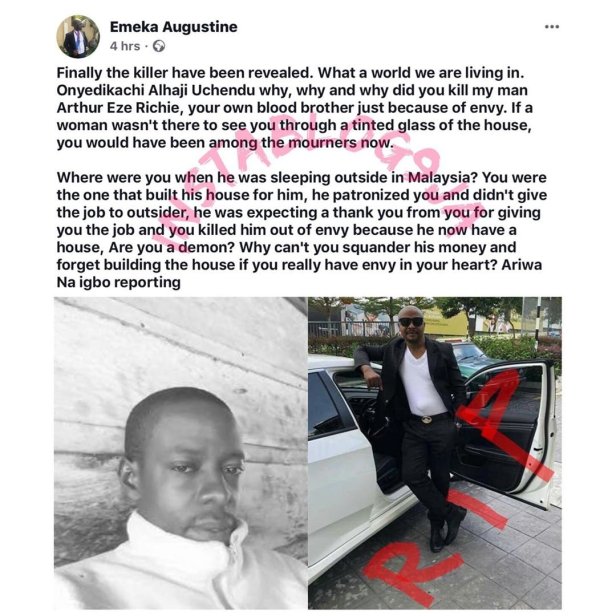 Uncategorized Malaysian-based man assassinated during his visit to Nigeria, was allegedly killed by his blood brother Date: June 21, 2019Author: daybreaknewonline 0 Comments Malaysian-based man assassinated during his visit to Nigeria, was allegedly killed by his blood brother. Share this: Share on X (Opens in new window) X Share on Facebook (Opens in new window) Facebook Share on LinkedIn (Opens in new window) LinkedIn Share on Pinterest (Opens in new window) Pinterest Share on Telegram (Opens in new window) Telegram Share on WhatsApp (Opens in new window) WhatsApp Email a link to a friend (Opens in new window) Email Like Loading... Related