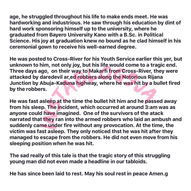 Uncategorized Date: July 5, 2019Author: daybreaknewonline 0 Comments Oh!! so Painful, Oh God,!! Robbers kill orphaned corper who self-sponsored his own education. Share this: Share on X (Opens in new window) X Share on Facebook (Opens in new window) Facebook Share on LinkedIn (Opens in new window) LinkedIn Share on Pinterest (Opens in new window) Pinterest Share on Telegram (Opens in new window) Telegram Share on WhatsApp (Opens in new window) WhatsApp Email a link to a friend (Opens in new window) Email Like Loading... Related